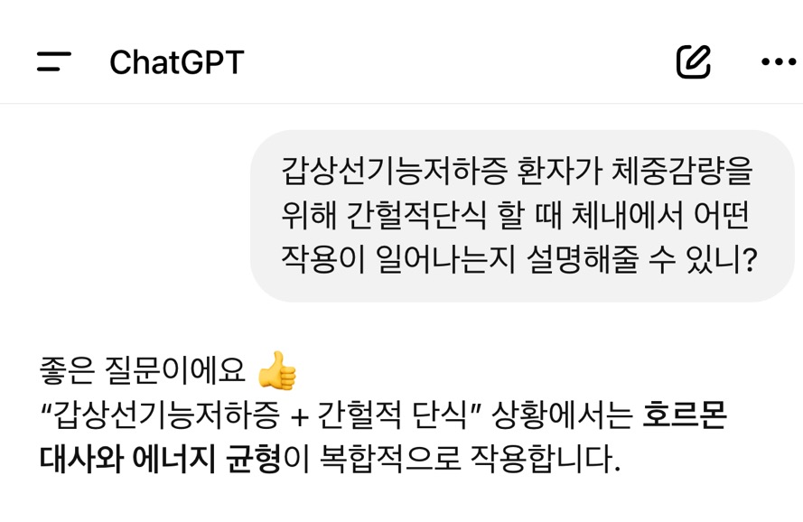 • 갑상선저하증 환자는 원래 대사가 느린데, 단식까지 하면 몸이 더 강하게 에너지 절약 모드로 들어감